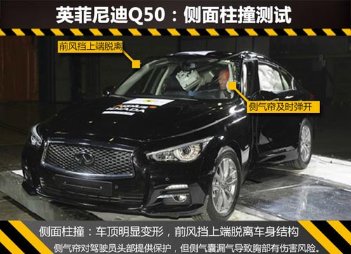 在最為嚴苛的柱撞測試中,英菲尼迪Q50因保護模擬假人胸部和骨盆的側安全氣囊位置不正確,這兩個身體部位在側面柱撞測試中時被扣分。撞擊時側氣簾及時彈出對駕駛員頭部形成良好保護,碰撞后車頂明顯變形,前風擋上端脫離車身結構。測試后發現,可以保護胸部和骨盆的側氣囊的通氣孔刮住車門內裝飾部件上并被撕裂,引發側安全氣囊更快的放氣,由此降低了對駕駛員身體的保護。所以模擬假人的胸部得分較低,有受到傷害的風險。柱撞滿分為8分,Q50的成績僅為6.3分,寶馬3系為7.4分。