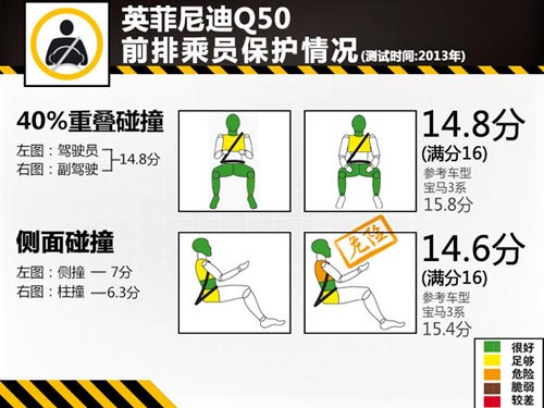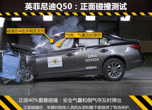 英菲尼迪Q50的駕駛艙在正面撞擊時保持穩定,發動機艙吸收了大部分能量后潰縮。碰撞后A柱未明顯變形,駕駛員生存空間基本保持完整。正安全氣囊、側安全氣囊和側安全氣簾同時彈開,駕駛員和乘客的頭部以及身體其他部位都受到了良好的保護。對于身材不等和坐在不同的位置的乘客, Q50提供的保護水平是基本一致的。正面碰撞測試滿分為16分,兩車的成績分別為14.8分和15.8分。