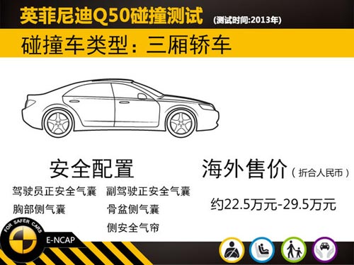 英菲尼迪采用全新命名后的首款轎車Q50將于明年正式進入國內市場銷售。這款將上市的新車有著怎樣的安全性,也是眾多消費者所關注的。近日網通社獲悉,英菲尼迪Q50在歐洲進行了碰撞測試并公布成績。值得關注的是,新車在側面柱撞測試中由于側安全氣囊存在著隱患,以至對車內人員保護有待提升。