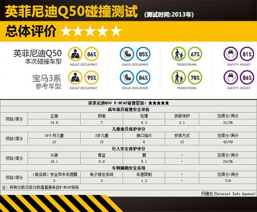 英菲尼迪Q50最終碰撞評定星級為最高的5星,我們選擇的參照車型寶馬3系也同樣達到5星標準。在四大項測試的總成績上,兩車不分伯仲。在兒童乘員安全項以及車輛輔助安全項測試中,Q50的成績均略高于寶馬3系;而在成年乘員安全和行人安全兩項測試中,寶馬3系的得分則略優于Q50。