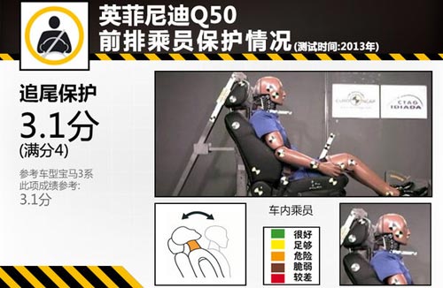 在模擬追尾碰撞時對車內乘員頸部保護的測試中,英菲尼迪Q50和寶馬3系的座椅以及頭枕均能在追尾碰撞事故時為車內乘員提供良好的保護,避免頸椎過度屈伸的損傷。此項測試滿分為4分,兩車均取得了3.1分的一致成績。