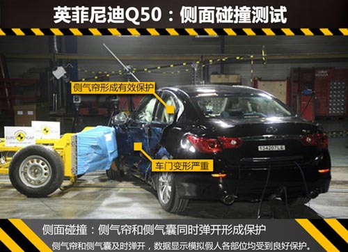 在側面碰撞測試中,Q50的側氣簾和側氣囊碰撞后及時彈開,雖然車門經撞擊后已嚴重變形,但數據顯示模擬駕駛員假人的頭部以及身體其他部位都受到良好的保護,此項測試滿分8分,Q50成績為7分,比寶馬3系低了1分。