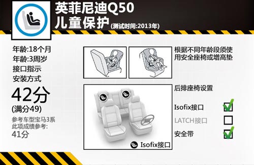 兒童保護是評定一款車型的重要標準之一,在正面和側面碰撞測試中,兒童座椅中的18個月和3周歲模擬假人都受到充分的保護。在兒童座椅安全接口提示和安裝方式方面,英菲尼迪Q50在后排座椅提供了兩個ISOFIX接口,安裝指示的各種標識都非常清晰。此車副駕駛安全氣囊也可以關閉,以便允許在座位上使用背向式兒童安全座椅,并且能為駕駛員提供清晰的使用方式以及警示信息。兒童保護測試成績滿分為49分,Q50成績為42分,3系成績為41分。