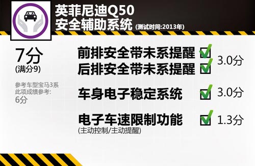 在車輛安全輔助系統測試中,考核內容為車速限制、ESP車身穩定系統以及前后排安全帶未系提示4項,每項裝配技術都將決定最終分值的高低。Q50全部配備了以上4項安全輔助系統,并且達到了測試要求。寶馬3系的電子車速限制系統因是選裝配置,所以該項測試沒有得分。車輛安全輔助系統測試滿分為9分,Q50的成績為7分,高出3系1分。