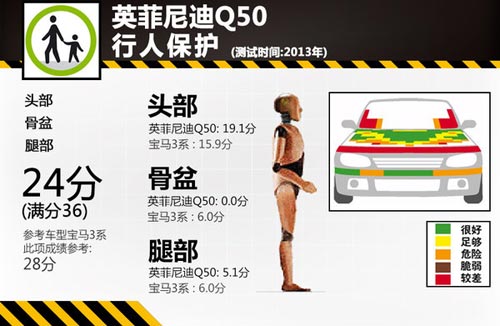 英菲尼迪Q50擁有配備了傳感器的智能發動機罩,當傳感器檢測到行人被撞時,發動機罩會自動升起保護行人頭部,車輛的速度和行人的身高在一定范圍內時這項功能會正常啟用。此車在發動機罩升起的位置進行了行人碰撞測試,測試結果顯示行人的頭部碰在整個發動機罩表面上可得到充分保護,A柱底端則是危險區域。行人頭部保護Q50得分較高,為19.1分,超過寶馬3系3.2分。但發動機罩前端區域卻對行人骨盆有造成傷害的危險,骨盆保護成績僅為0分,對行人骨盆保護還有待提高。此外Q50的保險杠對行人的腿部提供了基本的保護。腿部保護成績滿分為6分,Q50為5.1分,3系則為滿分。