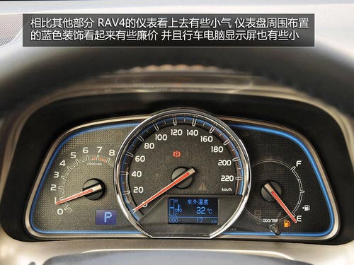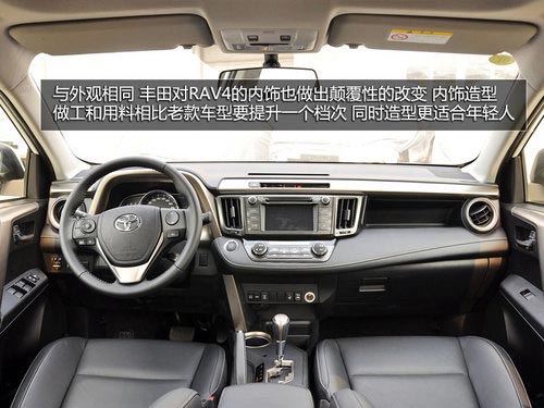內飾在視覺效果上提升也是十分明顯,亮色與暗色的搭配使對比更加強烈,豪華和運動成分也增加了很多。新款的RAV4在內飾上采用了硬塑料和真皮兩種材質組成。而方向盤和儀表盤的設計也是舒適度和易用性上進行考量。