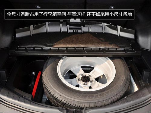 儲物空間還是比較豐富,不過每個空間都稍有些狹小,很多儲物盒都只有能放下一瓶礦泉水的大小。后排座椅可以進行4/6比例放倒,這也擴充了后備箱的儲物能力。備胎由車外移動到車內以后,占拒了后備箱內的空間,高度有所下降。