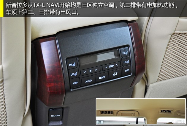 新普拉多從TX-L NAVI開始均是三區獨立空調,第二排帶有電加熱功能,車頂上第二、三排帶有出風口,在這樣一個寬敞的空間里,無論是夏季還是冬季,都能使車內快速達到適宜的溫度。