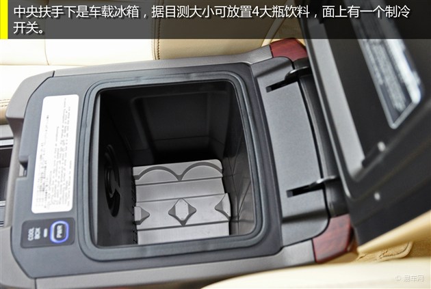 中央扶手下車載冰箱的空間比較大,目測可以放置4大瓶飲料,面上有一個制冷開關,與很多靠空調出風口降溫的車載冰箱不同,據了解普拉多的冰箱具有冰鎮效果,對于長途旅行,這樣一個大冰箱將非常實用。