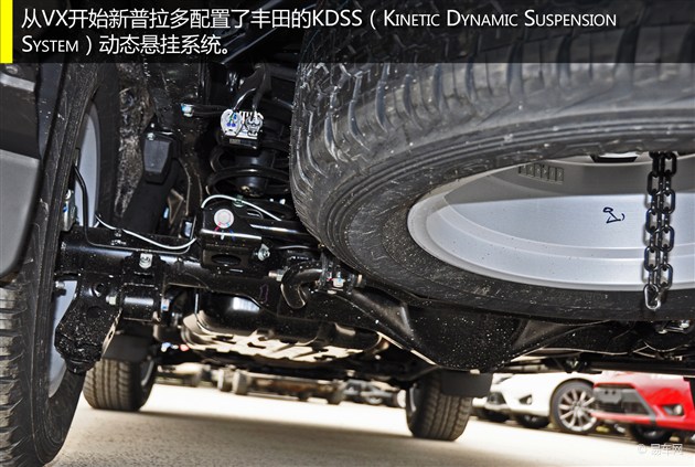 新普拉多仍就是前雙叉式獨立懸架(帶穩定桿),后四連桿機構式懸架,頂配則是空氣懸架。從VX開始新普拉多配置了豐田的KDSS(Kinetic Dynamic Suspension System)動態懸掛系統,其作用就是在好路上發揮防傾桿的效用,抑制車身側傾,保持較強的穩定性;到了崎嶇道路,就會釋放防傾桿的剛性,讓車輪有更自如的上下運動空間,從而吸收更多的震動。