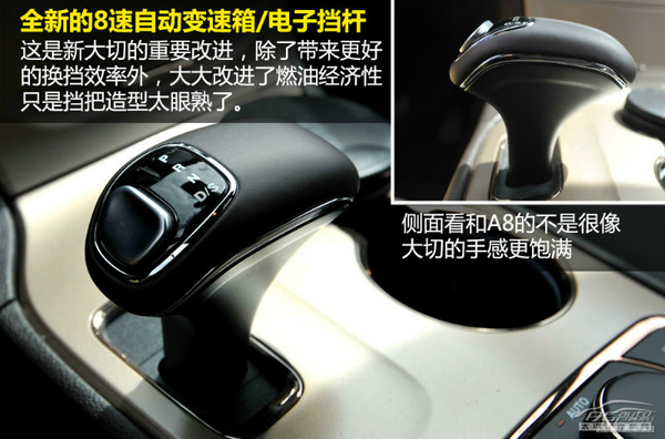 發動機沒有變化,繼續使用3.6L PentastarV6發動機和5.7LHEMI V8發動機,我們這次試駕的都是3.6L車型。新大切的亮點在于全新的8速自動變速箱,這臺ZF公司的變速箱我們已經非常熟悉了,奧迪、寶馬用的都是這臺變速箱,這是一款被我們認為可以媲美雙離合的變速箱。換擋極其平順且快速,而且質量與抗扭性更強。也可以為一直不省油的大切節省點資源。