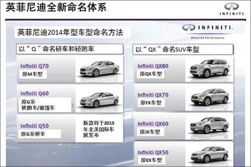 2012年末,英菲尼迪官方發布了全新的英菲尼迪旗下車型的全新命名方式,全新的命名規則將于2014年正式在國內執行,將以Q/QX兩個字母重新命名旗下轎車與SUV車型,在這其中,我們今天的所談到的英菲尼迪JX35將被命名為英菲尼迪QX60。