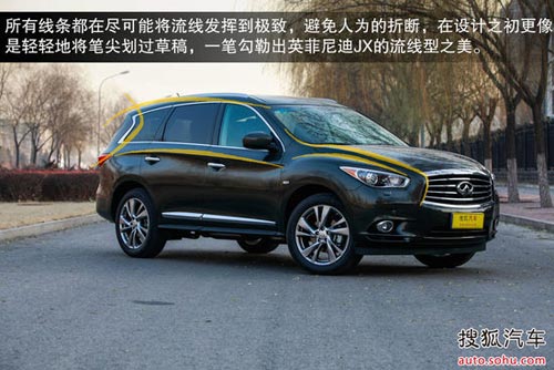 如果將整車的線條大致勾勒出來,我們可以大致看出英菲尼迪JX35所有線條都在盡可能的將流線型發揮到極致,避免人為的折斷,而設計師在設計之初更像是輕輕地將筆尖劃過草稿,一筆勾勒出英菲尼迪JX的流線型之美。