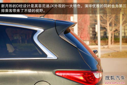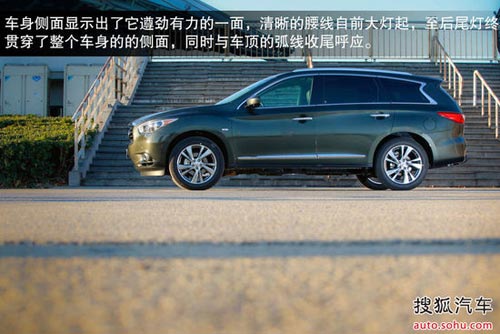 車身側面顯示出了它遵勁有力的一面,清晰的腰線自前大燈起,至后尾燈終貫穿了整個車身的的側面,同時與車頂的弧線收尾呼應。而新月形的D柱設計是英菲尼迪JX外觀的一大特色,演繹優雅的同時也為第三排乘客帶來了不錯的視野。