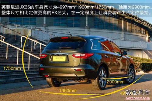 英菲尼迪JX35的車身尺寸為4997mm*1960mm*1750mm,軸距為2900mm。整體車身尺寸相比定位更高的FX還要大,這也在一定程度上讓不少消費者產生了定位錯覺,英菲尼迪JX引以為傲的車身尺寸成為了路人甲乙丙丁的各類“技術性”問題中曝光率相對較高問題,的確,在國內消費者普遍以空間論優劣的前提下,英菲尼迪JX的優勢成為了最吸引國內消費者的因素。
