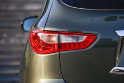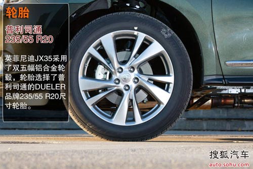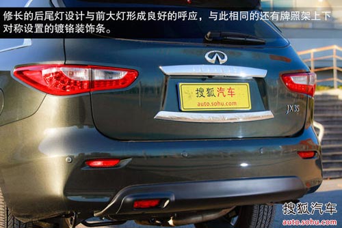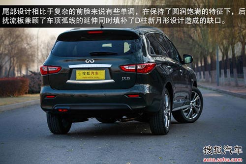 英菲尼迪JX35的尾部設計相比于復雜的前臉來說有些單調,在保持了圓潤飽滿的特征下,后擾流板兼顧了車頂弧線的延伸同時填補了D柱新月形設計造成的缺口。修長的后尾燈設計與前大燈形成良好的呼應。另外,英菲尼迪JX35采用了雙五幅鋁合金輪轂,輪胎選擇了普利司通的DUELER品牌235/55 R20尺寸輪胎。