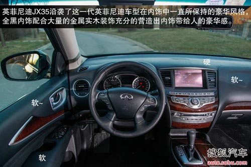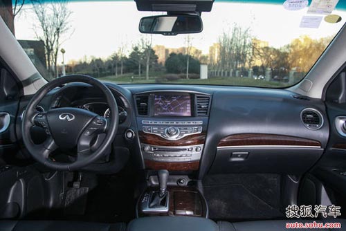打開車門,英菲尼迪JX35沿襲了這一代英菲尼迪車型在內飾中一直所保持的豪華風格,全黑內飾配合大量的金屬實木裝飾充分的營造出內飾帶給人的豪華感。