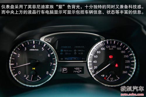 儀表盤采用了全新一代英菲尼迪的家族“紫”色背光,十分獨特的同時又兼備科技感。而中央上方的液晶行車電腦顯示可顯示包括車輛信息、狀態等豐富的信息。