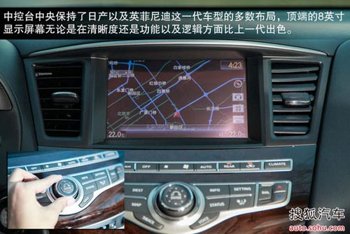 中控臺中央保持了日產以及英菲尼迪這一代車型的多數布局,頂端的8英寸顯示屏幕無論是在清晰度還是功能以及邏輯方面比一些英菲尼迪車型要出色很多,而且既可以支持觸摸控制,也能通過中控臺上的按鍵旋鈕進行操作。