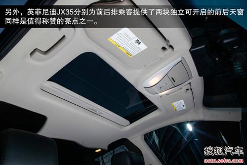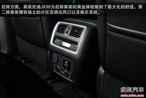 后排方面,英菲尼迪JX35為后排乘客的乘坐體驗做到了最大化的舒適,第二排乘客擁有獨立的分區空調出風口以及娛樂系統,配合設置在前排座椅頭枕后方的兩塊大尺寸顯示屏可以為后排乘客帶來影音享受。另外,英菲尼迪JX35分別為前后排乘客提供了兩塊獨立可開啟的前后天窗同樣是值得稱贊的亮點之一。