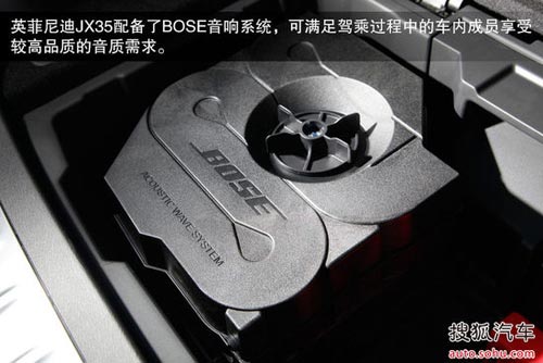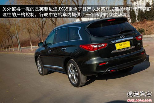 另外值得一提的是英菲尼迪JX35秉承了日產以及英菲尼迪品牌對于車輛靜謐性的嚴格控制,一臺安靜的VQ系列發動機,即便是在車外,也很難察覺它已處在工作狀態。行駛中它給車內提供了一個私密的乘坐環境,車門的密封以及底盤都使用了隔音材料,發動機高速運轉時的噪音能被很好地封閉機艙內。