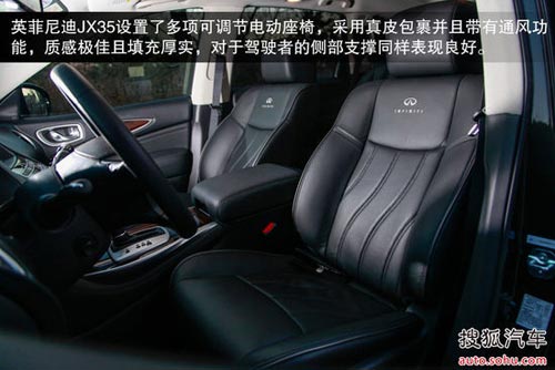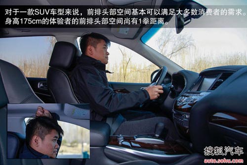 英菲尼迪JX35設置了多項可調節電動座椅,采用真皮包裹并且帶有通風功能,質感極佳且填充厚實,對于駕駛者的側部支撐同樣表現良好。對于一款SUV車型來說,前排頭部空間基本可以滿足大多數消費者的需求。身高175cm的體驗者的前排頭部空間尚有1拳距離。