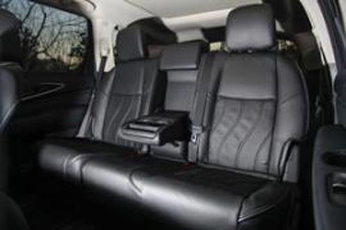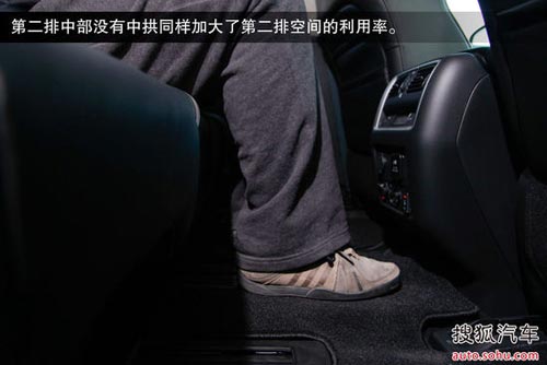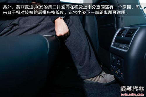 另外,英菲尼迪JX35的第二排空間在視覺上十分寬闊還有一個原因,即是來自于相對較短的后排座椅長度,正常坐姿下一拳距離即可說明。中部沒有中拱同樣加大了第二排空間的利用率。