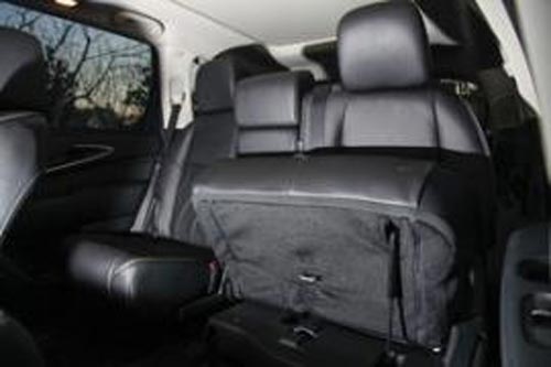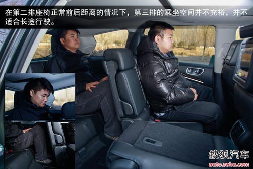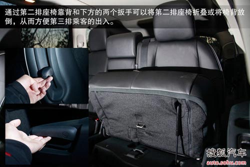 通過第二排座椅靠背和下方的兩個扳手可以將第二排座椅折疊或將椅背放倒,從而方便第三排乘客的出入。在第二排座椅正常前后距離的情況下,第三排的乘坐空間并不充裕,并不適合長途行駛。