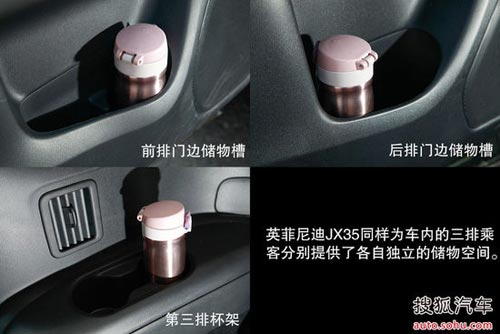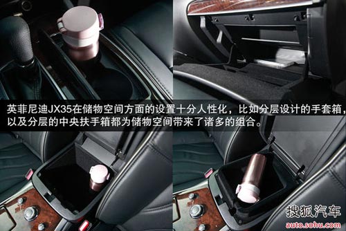 英菲尼迪JX35在儲物空間方面的設置十分人性化,比如分層設計的手套箱,以及分層的中央扶手箱都為儲物空間帶來了諸多的組合。同時為車內的三排乘客分別提供了各自獨立的儲物空間。