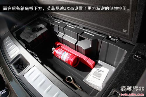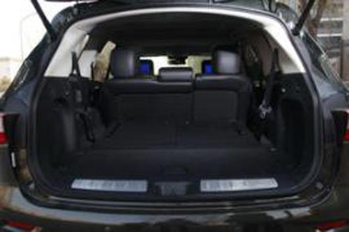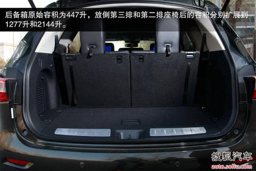 由于7座的設計,在第三排座椅未放倒的情況下,英菲尼迪JX35的后備箱空間并不充裕。后備箱原始容積為447升,放倒第三排和第二排座椅后的容積分別擴展到1277升和2144升。而在后備箱底板下方,英菲尼迪JX35設置了更為私密的儲物空間。