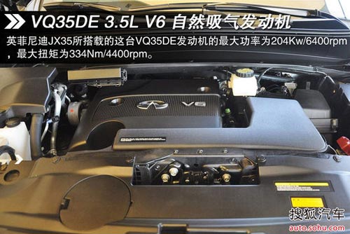 英菲尼迪JX35搭載了日產大名鼎鼎的VQ系列DE版本發動機,DE版本發動機是日產專為基于前驅平臺生產的車型所配備(基于后驅平臺生產的車型大多搭載VR版本發動機),而我們今天所試駕的英菲尼迪JX35與其家族中的大多數后驅車型不同,其正是基于前驅平臺所打造,分為前驅以及四驅兩款車型。英菲尼迪JX35所搭載的這臺VQ35DE發動機的最大功率為204Kw/6400rpm,最大扭矩為334Nm/4400rpm。而與之匹配的則是一款可模擬6速帶有手動模式的CVT無級變速箱。