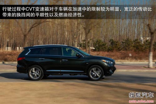 行駛過程中CVT變速箱對于車輛在加速中的限制較為明顯,不過好在英菲尼迪JX35為駕駛者提供了一套更加自由的帶有手動模式的CVT無級變速箱。切換至手動模式后,車輛在加速過程中的換擋時機可由駕駛者自行掌握。當然,CVT并不是一無是處,寬泛的傳動比帶來的換擋間的平順性以及對于一款排量超過3L的大排量車型來說,CVT可以為燃油經濟性方面做出極大的貢獻。