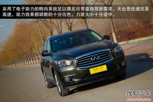 雖然JX35并不主打運動性能,不過采用了電子助力的轉向系統足以滿足日常道路駕駛需求。無論是低速還是高速,助力效果都調教的十分出色,力度大小十分適中。制動性能同樣讓人滿意,制動效果線性不突兀,制動踏板力度反饋適中,保障了駕駛者的信心。