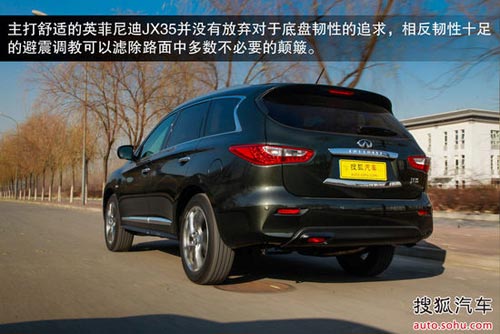 而底盤的調教方面,主打舒適的英菲尼迪JX35并沒有放棄對于底盤韌性的追求,相反,韌性十足的避震調教可以濾除路面中多數不必要的顛簸,急加速與全力剎車的過程中不用擔心過軟的前后懸掛會使車輛產生明顯的點頭或者抬頭現象,而在車輛過彎中可以得到不錯的側向支撐。