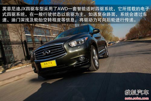 英菲尼迪JX四驅車型采用了AWD一套智能適時四驅系統,它所搭載的電子式四驅系統,在一般行駛狀態以前驅為主,如遇復雜路面,系統會透過車速、油門深淺及輪胎空轉程度等信息,將驅動力可向后輪進行傳遞。最大前后動力分配比例可達50:50,已提供最佳的行駛穩定性。