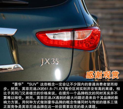 2012年初,這款生產于美國田納西州的英菲尼迪JX35首先投放在北美市場,而在隨后的成都車展中正式亮相國內并于去年的廣州車展中正式上市,其中共推出2款車型,售價為61.8-71.8萬元。