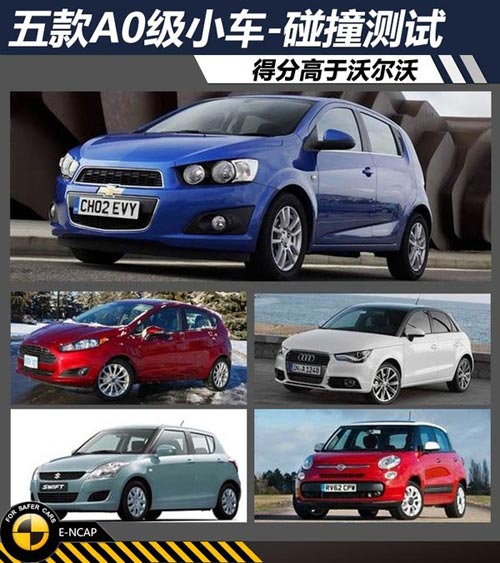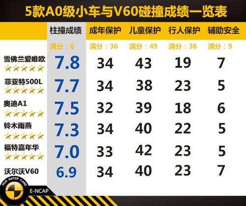 我們這次選擇的車型分別為:雪佛蘭愛唯歐、菲亞特500L、奧迪A1、鈴木雨燕以及福特嘉年華。首先從E-NCAP公布的柱撞成績來看,這5款小車都取得7分以上的良好成績,全部高于沃爾沃V60這項測試取得的6.9分的成績。5車中愛唯歐的成績排在第一名,得分為7.8分。第二名是菲亞特500L,成績是7.7分。兩者相差僅0.1分,都非常接近滿分8分。接下來是奧迪A1和雨燕,成績分別為7.5分和7.3分。排在5車最后一名的是嘉年華,不過也取得了7.0分的理想成績。