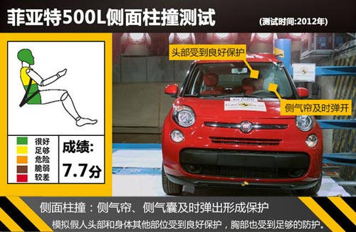 菲亞特500L碰撞后及時彈開的側(cè)氣簾對模擬駕駛員假人頭部提供了良好保護,同時側(cè)氣囊也對其胸部提供了足夠防護,數(shù)據(jù)讀數(shù)顯示假人身體其他部位均為良好狀態(tài)。這款小車的側(cè)面柱撞測試得分為7.7分,同樣較為接近滿分。菲亞特500L雖然目前國內(nèi)暫無銷售,但未來將有望引入中國市場。