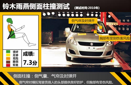 鈴木雨燕經(jīng)撞擊后雖然車輛裝備的側(cè)氣簾及時彈出,對模擬駕駛員假人的頭部形成良好保護,但胸部則有受到傷害的風(fēng)險。數(shù)據(jù)讀數(shù)顯示假人除胸部之外其他身體部位均能受到良好保護。雨燕的碰撞成績?yōu)?.3分,測試時間為2010年。如今國產(chǎn)雨燕采用了TECT高強度車身構(gòu)造設(shè)計,全車的高強度雙面鍍鋅鋼板和碰撞緩沖材料等易吸收撞擊力,能夠高效率的吸收和分散來自不同方位的碰撞能量防止車艙變形,最大限度減輕對駕乘者的傷害。不過雨燕還需進一步提升對車內(nèi)人員的防護標(biāo)準(zhǔn),另外此車全系僅配置前排正安全氣囊也稍顯不足。