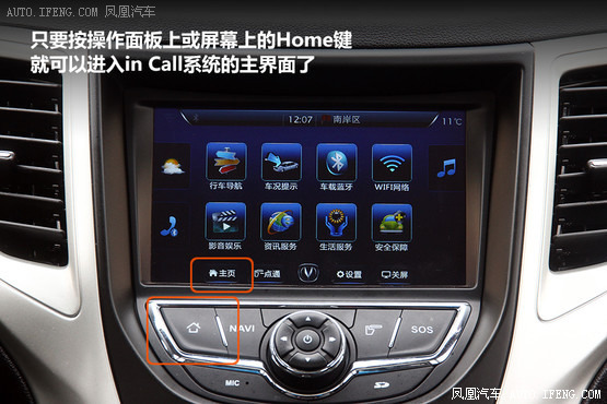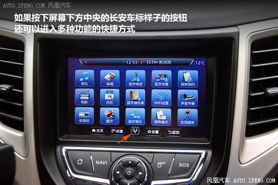 in Call系統的功能實現主要在可觸摸操作的中控臺液晶顯示屏和下方的一組按鍵。只要按操作面板上或屏幕上的Home鍵,就可以進入in Call系統的主界面了。如果按下屏幕下方中央的長安車標樣子的按鈕,還可以進入多種功能的快捷方式,操作起來更加方便。