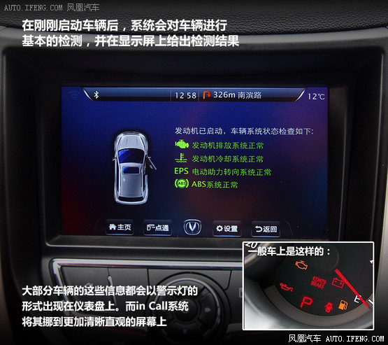 一般車輛上都能夠提供的功能這里就不再過多介紹了,我們主要來介紹一下in Call系統提供的一些比較獨特的功能。首先是車輛自檢功能,在剛剛啟動車輛后,系統會對車輛進行基本的檢測,并在顯示屏上給出檢測結果。這個功能從本質上說并不是什么很先進的東西,因為大部分車輛的這些信息都會以警示燈的形式出現在儀表盤上。而in Call系統將其挪到更加清晰直觀的屏幕上,對于一些不太留意儀表盤的新手來說會帶來更易懂的提示。