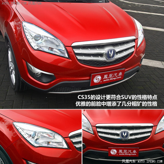 相比起其他幾款車型,CS35的設計更符合SUV的性格特點,優雅的前臉中增添了幾分粗獷的性格,進氣口上粗壯的雙橫格柵就體現除了這樣的氣質。三角形的大燈是長安家族的一貫設計風格,尺寸相對比較大,看上去更具有神韻。