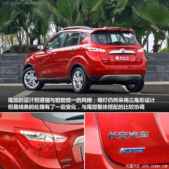 尾部的設計則遵循與前臉統一的風格,尾燈仍然采用三角形設計,但是線條的處理有了一些變化,與尾部整體搭配的比較協調。在車尾兩側的裝飾條上設計了一個長安的LOGO,這個細節的處理比較巧妙,就是這小小的徽標,為尾部增添了不少的魅力。