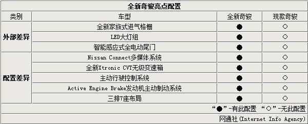 新一代奇駿作為全新CMF平臺打造的換代產品,在整車造型以及車輛配置等方面相對現款奇駿來說有了脫胎換骨的變化。不僅外觀上更加動感、時尚,一改現款車型保守方正的造型,并且諸如LED大燈組、新Xtronic CVT無級變速箱、Nissan Connect整合式多媒體系統、主動行駛控制系統等多項高科技配置也是首次應用在新車上。此外,新奇駿還第一次引入了全球首創的Active Engine Brake發動機主動制動系統。它可在車輛過彎或下坡時自動切入此模式,并通過對CVT變速箱的控制來增進發動機制動效果,進而帶來更好的制動效能并減輕制動系統的負擔,進一步提升了行車的安全性。