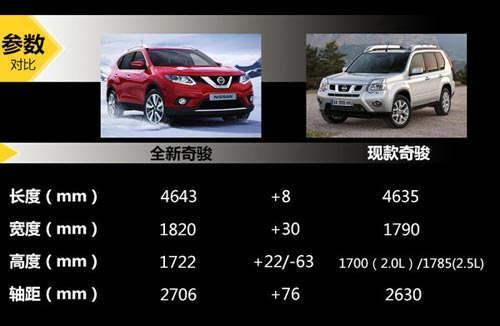 全新奇駿在車身尺寸上均做了調整,長和寬分別為4643mm和1822mm,軸距為2706mm。和現款車型相比,長度增加了8mm,寬度增加了30mm,軸距更是加長了76mm之多。新奇駿的高度為1722mm,因現款奇駿根據排量的不同所配備的車頂行李架也不同,高度分別為1700mm和1785mm,所以新老對比中高度一項分別增加了22mm和降低了63mm。由于車身尺寸和軸距的加大,使得新奇駿不單在駕乘空間上有更好的表現,并且首次增加了第三排座椅。