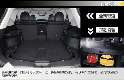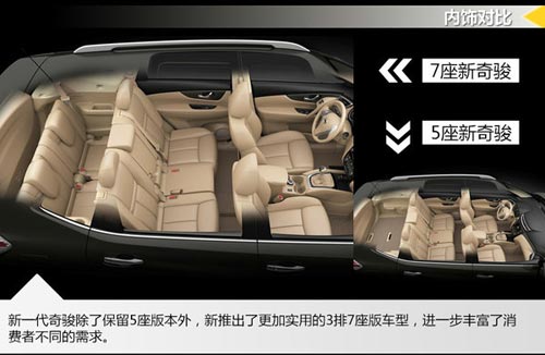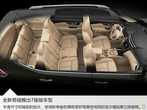 車身長度、寬度和軸距的增加使得全新奇駿推出了帶有第三排座椅的車型,7座版新車的推出讓消費者有了更多的選擇。相對于5座車型,7座版新奇駿在載人或載物方面更為靈活。