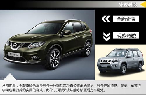 全新奇駿外形以日產的Hi-Cross概念車為設計藍本,不再延續現款車傳統的硬朗外觀造型,新車車身線條更加流暢、圓潤和柔美。前臉采用日產新一代家族化設計風格,碩大飽滿的U型鍍鉻裝飾條被嵌入黑色蜂窩狀進氣格柵上,看起來更加充滿質感。保險杠硬朗線條配以銳利的五邊形大燈組,拋棄了現款車前部平淡造型。