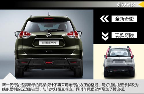 全新奇駿車尾的造型顯得很緊湊,飽滿動感的尾部設計不再是老奇駿方正的格局,尾燈組也由豎條狀改為線條犀利的五邊形造型,與前大燈很好的相互呼應。尾門也啟用了比較常見的掀背式設計,其開啟角度可以達到80度,非常實用。此外,新車車尾的頂部新增加了擾流板。