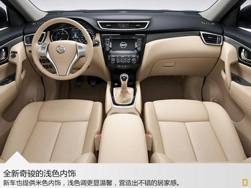 新一代奇駿的內飾采用了全新設計,整體感覺不再像老款車那樣保守單調。環抱式中控臺上鋼琴烤漆工藝、金屬拉絲以及鍍鉻裝飾得以應用,內飾整體風格凸顯時尚、精致和豪華。同時新車提供深淺兩種內飾顏色,深色內飾很有科技感和品質感,而淺色內飾則更顯溫馨,營造出不錯的居家感。