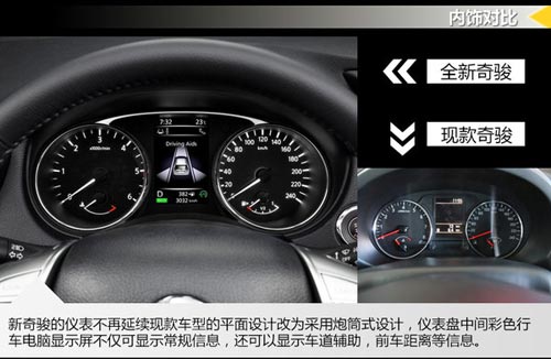 新奇駿的儀表由現款車型的平面設計改為采用炮筒式設計,更有運動風范,儀表盤中間大尺寸彩色行車電腦顯示屏,不僅可顯示行駛里程、油耗、溫度等常規信息,還可以顯示車道輔助,前車距離等信息。新奇駿將搭載最新Nissan Connect多媒體樂系統,這套系統除了能夠提供導航、信息顯示和娛樂等多種常規功能,也可實現與智能手機的無縫整合連接。此外,這套多媒體系統還支持藍牙通訊及USB、AUX-IN等多媒體擴充接口。